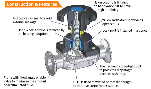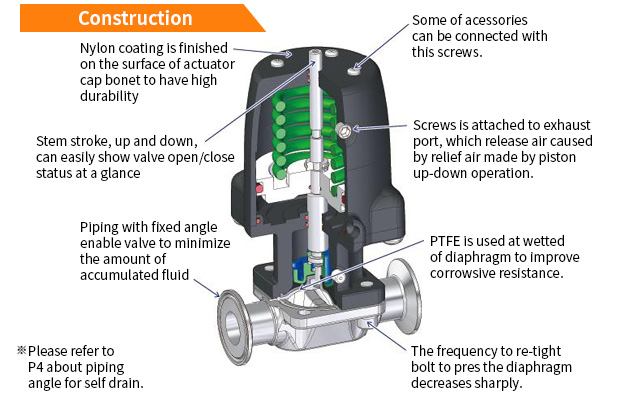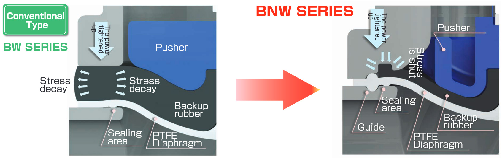 BNW Series: Diaphragm has two touchlines (projection). The outer line serves as a guide for body and actuator while the inner line serves as a seal. This construction will not have rubber slack caused by long term use.
